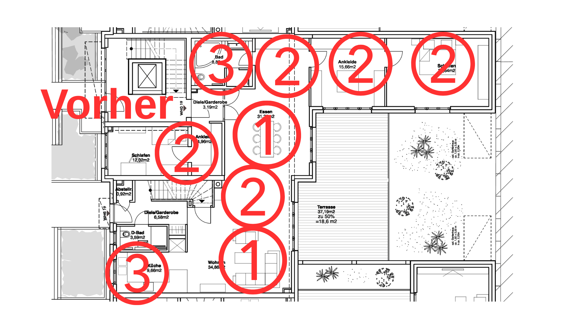 - Schritt 1: 60 Min für die Erstanalyse, Kundenwünsche- und Anforderungen und Lösungsideen werden im Grundriss gescribbelt - 60 min Onlineberatung zum Kennenlernen kostenlos!